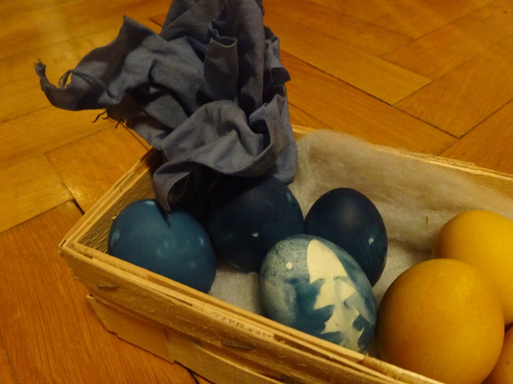 Mein Fazit: Die Farben – bis auf Birke-Brennessel sind wirklich richtig kräftig geworden. Mit so einem intensiven Blau hätte ich nicht gerechnet. Ich bin sehr zufrieden mit den Farben. Auch der Stoff wurde gut eingefärbt und man kann auch ein bisserl die Blätter und Blüten auf den Eiern wieder finden. Die Farbe Rot fehlt mir noch – aber das probiere ich nächstes Jahr aus!