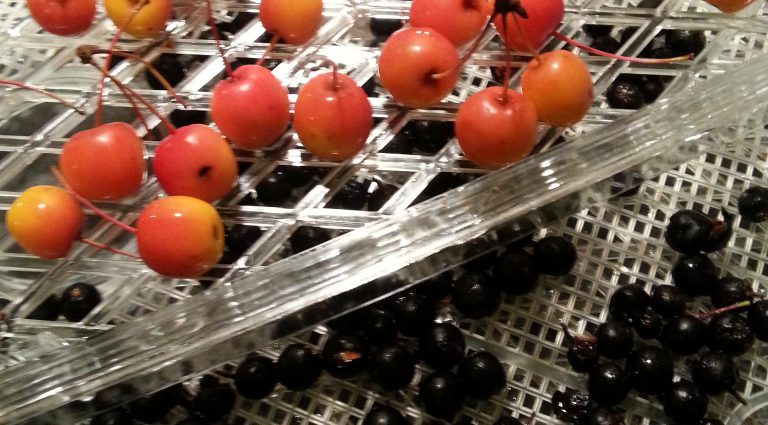 Wenn alles schön trocken ist, möchte ich meine Hagebutten noch mit getrockneten Holunderbeeren, getrockneten Weißdornbeeren und Stücken getrockneter Äpfel mischen.