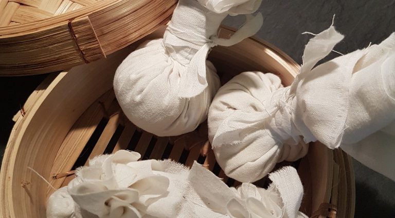 Für den Körper habe ich größere Stempel gewickelt und für eine Gesichtsmassage kleinere. Man soll immer mit zwei Stempeln arbeiten. Die Stempel werden zur Vorbereitung für zehn Minuten in kaltes Wasser gestellt. Damit die guten Inhaltsstoffe nicht vorzeitig abgegeben werden wird kaltes Wasser zum Einweichen verwendet. Die eingeweichten Kräuterstempel werden dann in einem Dampfgarer/Dampfaufsatz/Sieb über kochendem Wasser erwärmt. Die warmen/heißen Stempel werden dann auf die Haut getupft – die Wirkung ist ähnlich einer HotStone-Massage.