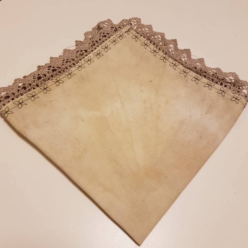 Nach dem Färben und Trocknen habe ich die Tüchlein sehr heiß gebügelt und mit Ziernähten eingesäumt; das „Brennesseltuch“ hat ein Spitze bekommen. Beim nächsten Mal sollte ich allerdings darauf achten, doch einen weicheren Stoff zu nehmen 🙂 z.B. alte Bettwäsche ist super dafür – meine Leinenvariante ist dann doch nicht so schmeichelzart zur Nase 🙂